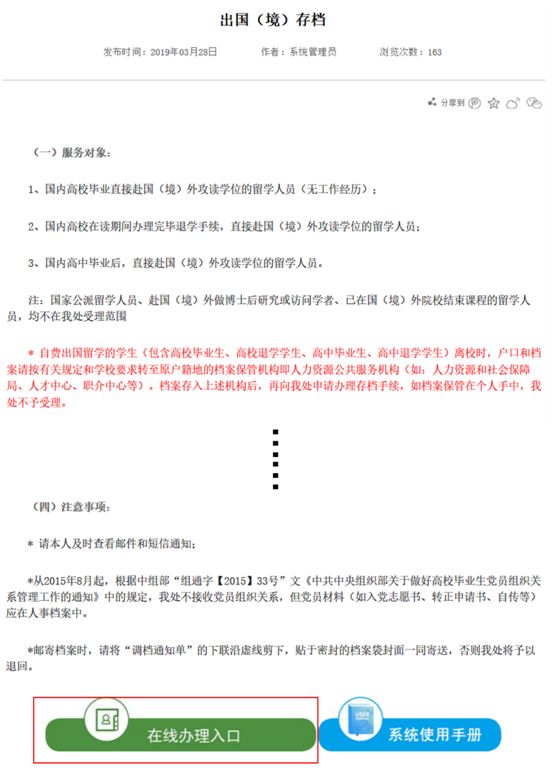 2019年留学存档案相关业务仅受理线上申请。2019年08月05日留学存档系统上线试运行,档案相关业务的办理采用线上申请服务模式,访问地址