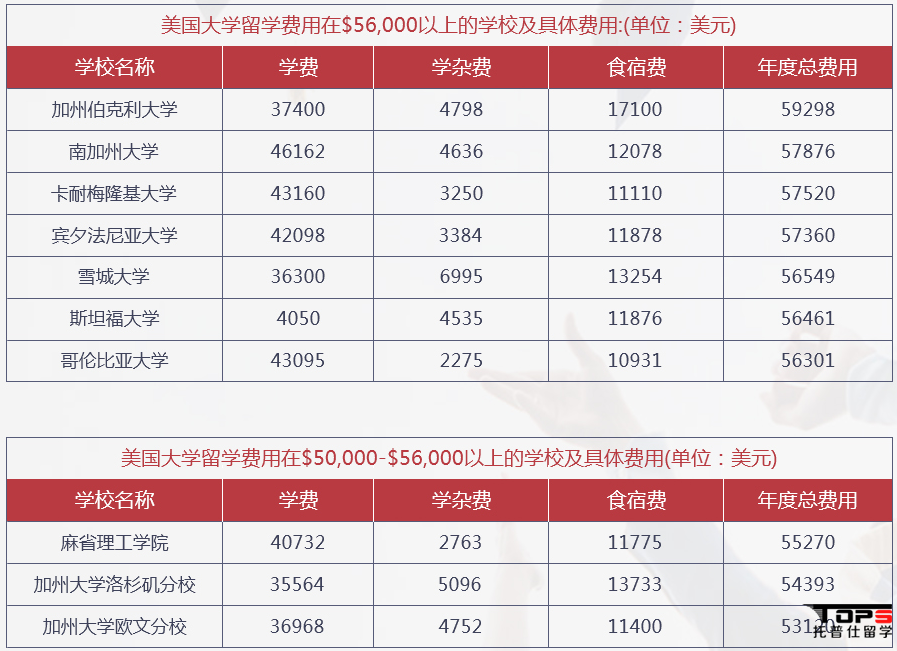 上面是一些美国知名大学留学产生得费用表,主要是一学杂费为主的,学杂费包括服务费、健康保险费、学校设施使用费、书本费等等。美国教材费用比较高,很多学生会选择买2手书,需要提醒的是美国是一个极为重视版权的国家。