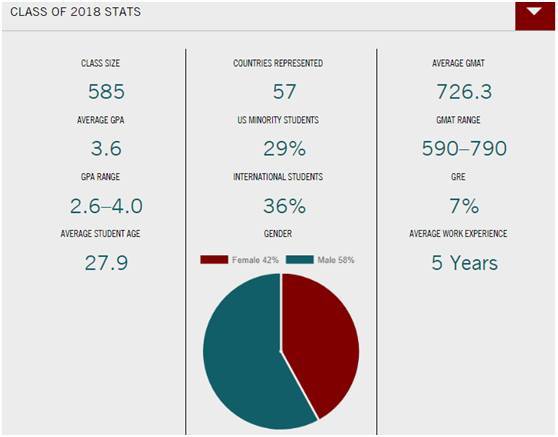根据2018年级录取数据(下图)来看,芝大MBA项目申请成功者大部分来自商业、人文科学、经济学、工程学、自然科学、法律等专业背景。录取平均GPA在3.6,GMAT726.3,录取学生平均年龄在27岁,平均工作经验为5年,芝加哥大学商学院国际学员比例逐步提高,国际学员在学员总数中所占比例达到了36%,这些MBA学员由于来自不同文化背景,在一起学习、讨论时,更容易培养学员们的国际化视野。