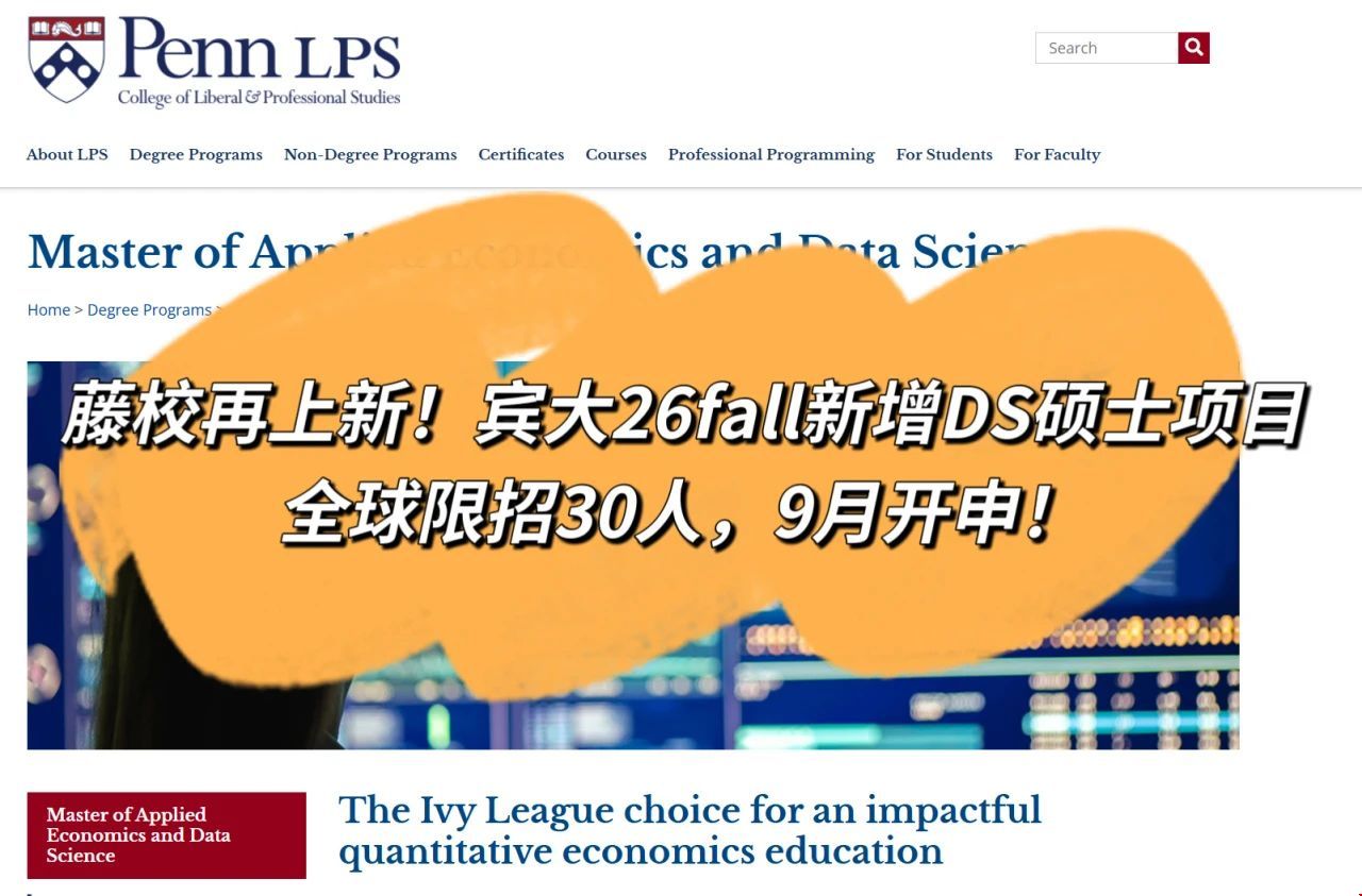 宾夕法尼亚大学文理学院宣布26Fall新开设一个硕士项目:应用经济学与数据科学硕士。此项目预计9月开放申请!首届仅招生30人,截止日期为2026年1月15日。以下内容就来带大家详细了解一下宾大26fall新增应用经济学与数据科学硕士的详细情况。