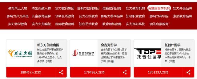 有谁知道知名美国留学中介有哪些?2018年网易教育年度大选云集了来自全国的教育界专家、学者及优秀教育企业,作为教育行业内最受关注的年度颁奖盛典之一,排在前三名的托普仕170133人支持,历时多日通过网...