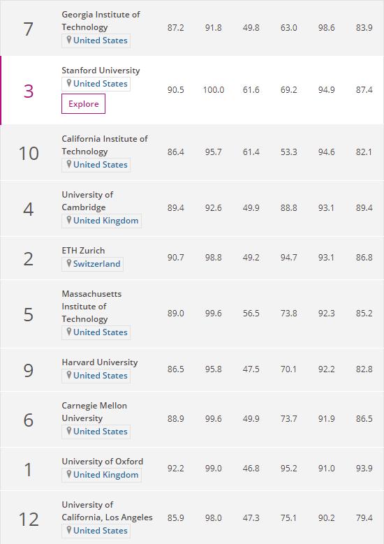 知名大学排名机构THE(泰晤士高等教育)发布了世界大学计算机排名,斯坦福第2、加州理工第3,第一竟然是佐治亚理工,苏黎世联邦理工学院位居第4,剑桥大学位居第4。以下为榜单前十:...