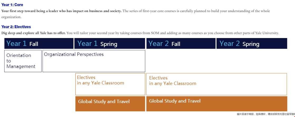 Yale SOM的MBA项目都为两年制,一共由四个学期组成,而每个学期又被分为两个“半学期”,比如秋季学期Fall Term被分为 Fall 1 和Fall 2。第一年的Fall Term全为核心课程,之后的Spring Term就可以有一半的选修课程。