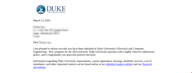 最终成功赢得了杜克大学招生委员会的认可,收获了电气与计算机工程硕士项目的录取通知书。这一成就标志着他在该领域学术追求的新起点,也为其未来的职业发展开启了广阔的大门。G同学的经历为其他怀揣学术梦想的同学树立了榜样,鼓励他们勇敢追求目标,在科研道路上不断探索前行。