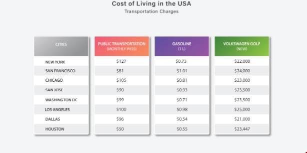 美国主要城市的公共交通包括公共汽车,火车,地铁,出租车,因此非常方便。如果您住在城市附近,则还可以使用自己的私家车上下班。费用会有所不同,因为很多地方的汽油价格都不一样。