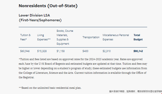 密歇根州内学费一年不足2万美刀,州外学生学费一年超6万美刀,折合人民币43万。