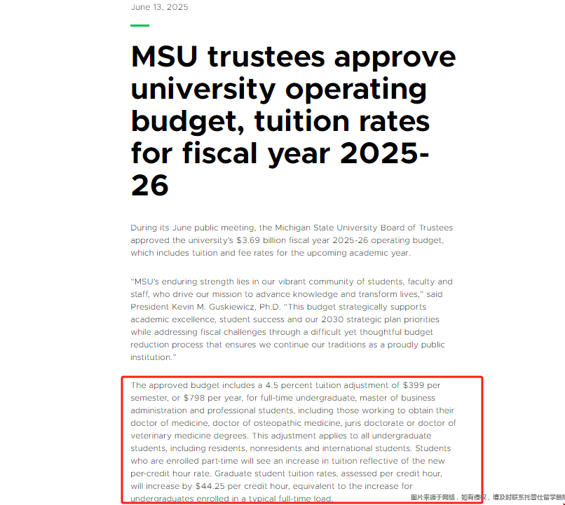 密歇根州立大学一直以平民学费著称,但是近期该大学迫于36.9亿的财政预算,不得已在2025-26学年学费上调4.5%,它适用于本科和研究生,下面就随托普仕留学老师一起来看看吧!