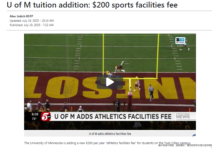 明尼苏达大学将为双城校区学杂费新增一项“体育设施费”,每年需要支付200美元,据悉,校董会于6月中旬批准了这项费用,作为年度运营预算的一部分。学生们反馈,他们在新学年开始前两个月得知新费用时感到很惊讶。下面就随托普仕留学老师详细来了解下吧!