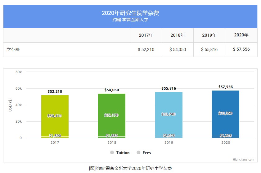 2019-2020学年,约翰·霍普金斯大学的本科生学杂费为$ 55,350。研究生院的学杂费为$ 57,556。除学杂费外,学生的生活费用为$ 17,428(在校园内居住)和$ 13,353(在校外居...