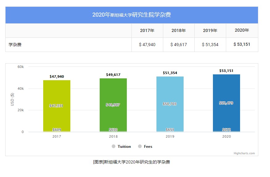 2019-2020学年,斯坦福大学本科的学杂费为$ 53,529。研究生院的学杂费为$ 53,151。此外还有生活费,包括学费和其他费用,为19,796美元。下面托普仕Alice老师结合费用统计图表为...