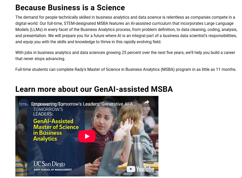 加州大学圣地亚哥分校(UCSD)的商业分析硕士(MSBA)项目是一个全日制课程,专注于培养具备商业分析和数据科学技能的专业人才。该项目是 STEM 认证的,旨在帮助学生在快速发展的数字世界中保持竞争力。以下内容就来带大家详细了解一下加州大学圣地亚哥分校商业分析硕士怎么样?