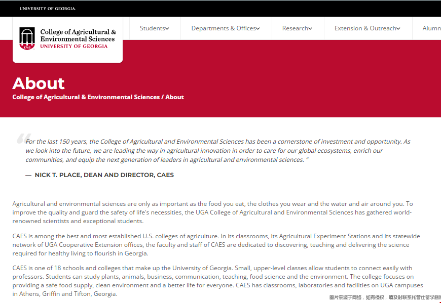 CAES是组成佐治亚大学的18所学院之一。小型的高级班级可以让学生轻松地与教授建立联系。学生可以学习植物、动物、商业、通信、教学、食品科学和环境。学院致力于为每个人提供安全的食品供应,清洁的环境和更好的生活。CAES在乔治亚州的雅典、格里芬和蒂夫顿校区设有教室、实验室和设施。