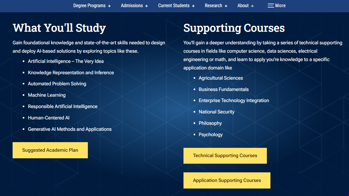 四年课程规划:提供四年建议学术路径(Suggested Academic Plan),从大一数学编程基础到大四项目设计与实习实践,每一步都为进入AI行业或深造研究铺好基础。 此外,学生还需完成至少18学分的“支持性课程”(Technical & Application Supporting Courses),涵盖数据科学、网络安全、计算机视觉、统计分析等多个细分方向,鼓励学生构建属于自己的AI知识图谱。