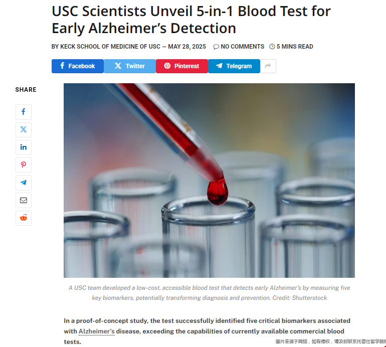 在一项概念验证研究中,南加大科学家测试成功识别了与阿尔茨海默病相关的五种关键生物标志物,超过了目前可用的商业血液测试的能力,且成功推出了5-in-1血液检测早期阿尔茨海默氏症,它比市面上检查更加高效且低成本,下面就随托普仕留学老师一起来看看吧!