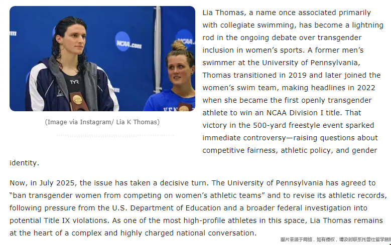 政府的调查重点是跨性别运动员利亚·托马斯(Lia Thomas),她在2021-2022赛季参加了该校女子游泳队。她成为第一个赢得NCAA一级联赛冠军的变性女性,并于2022年毕业。