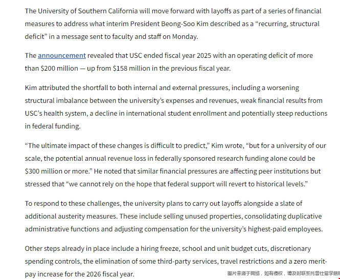 公告显示,南加州大学在2025财年结束时的运营赤字超过2亿美元,高于上一财年的1.58亿美元。
