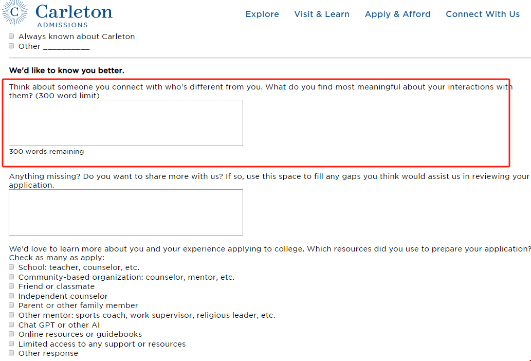卡尔顿学院官方:Think about someone you connect with who's different from you. What do you find most meaningful about your interactions with them? (300 word limit)