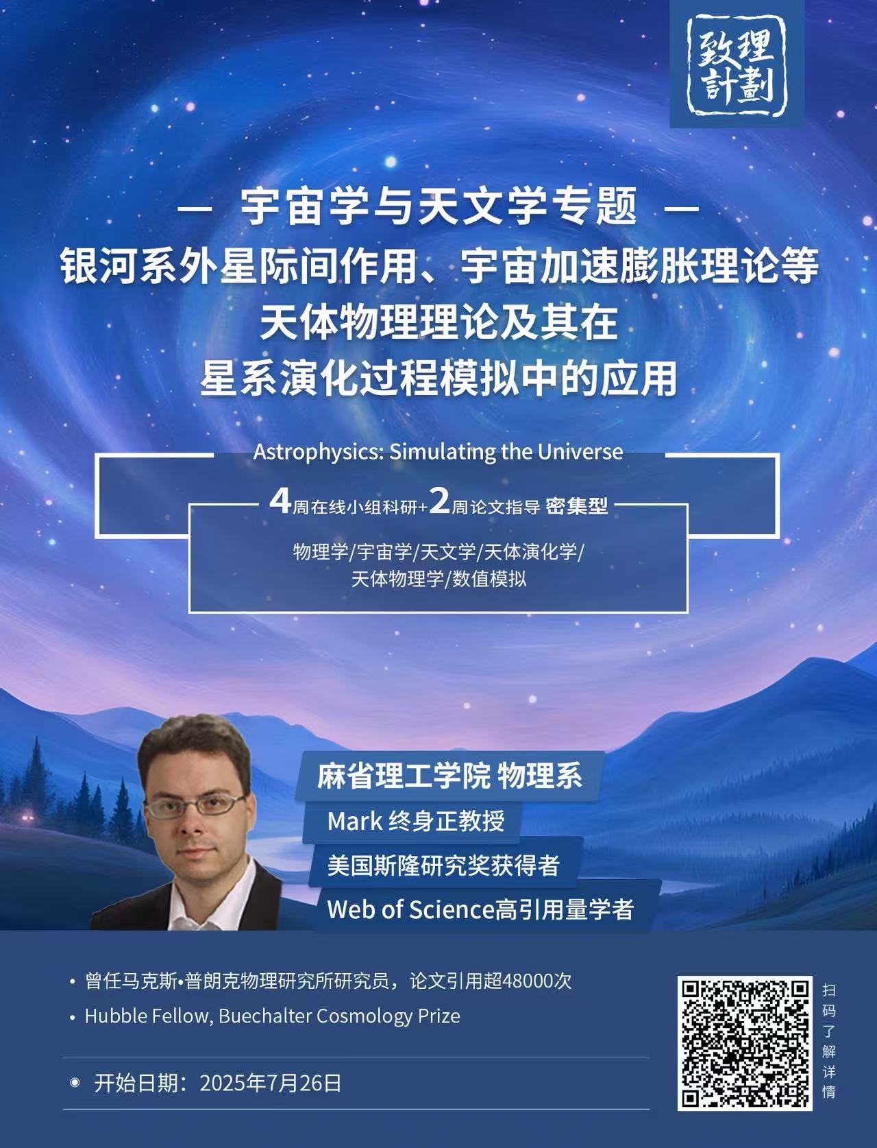 Mark导师现任麻省理工学院(MIT)物理系终身正教授、理论天体物理学家,它曾获素有“诺贝尔风向标”美誉的美国斯隆研究奖(Sloan Research Fellowship)、布切特宇宙学奖(BCP);连续2次获得全球最大的综合性学术网站”Web of Science”高引用量研究员“称号。他也是迄今为止最权威的星系形成模拟系统——揭示计划(Illustrate Program)的主要设计者之一。在校主要讲授天体物理、量子物理、粒子物理、电动力学等多个课程。主要研究兴趣包括星系结构和形成、暗物质物理和大规模流体动力学模拟。